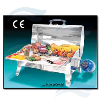 Gril s odklápěcím víkem a regulací plynu. Vyrobeno z nerezu. Rozměr 23x46 cm.